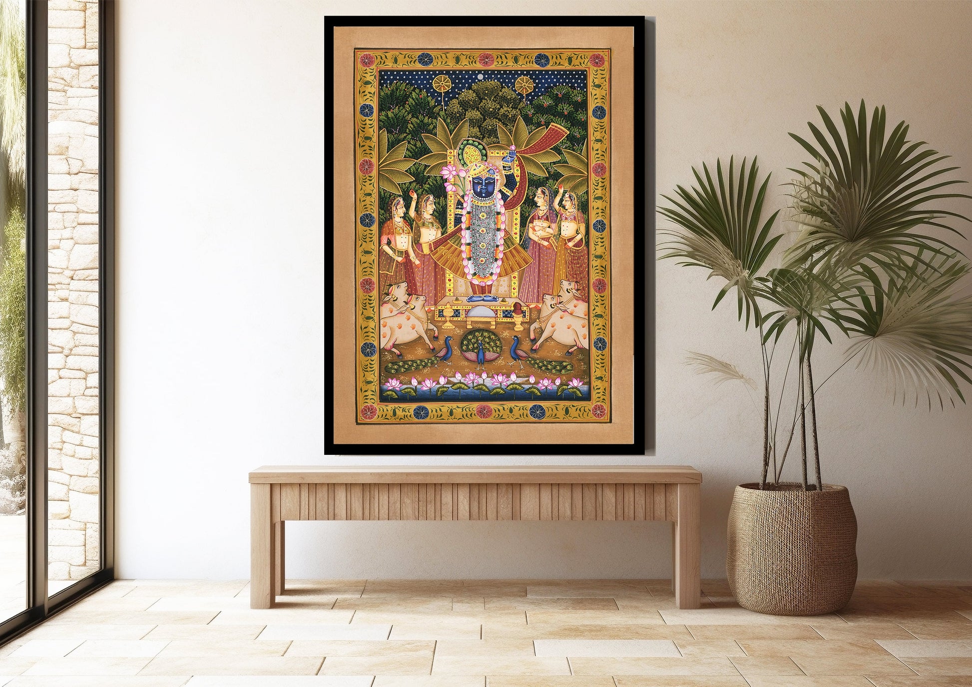 Pichwai paintings are intricate and devotional artworks that originated in Nathdwara, Rajasthan, centered around the worship of Lord Krishna in his form as Shrinathji. Rich in detail, symbolism, and color, these paintings traditionally depict scenes from Krishna’s life, festivals, and rituals. Pichwai art embodies the cultural and religious heritage of India, blending devotion with artistic mastery to create timeless visual narratives.